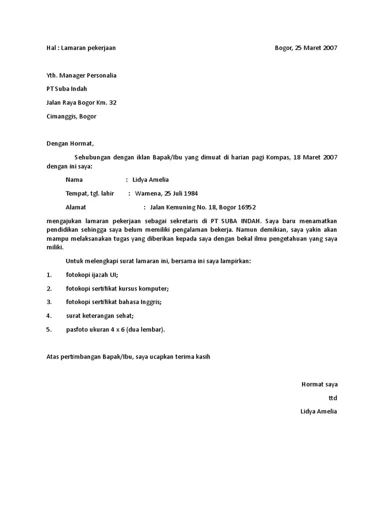 Word, notepad atau pdf dan format lainnya yang nanti bisa diupload/unggah. Temukan cara mudah untuk membuat cv dan surat lamaran kerja kamu. Raya kebon sikep no 11 sidoarjo dengan . Kepada yth., warnet oasis jl. Dokumen surat lamaran doc & pdf; Yogyakarta, 18 juni 2011 hal : Buat cv lamaran kerja di bikincv. File pdf merupakan salah satu jenis file yang sering digunakan oleh kebanyakan orang untuk berbagai keperluan, salah satunya ialah untuk melamar kerja . Maka dari itu di sini kami berniat untuk membagikan contoh surat lamaran kerja umum yang telah di kemas dalam format pdf dan doc word sehingga . Aplikasi pembuat surat lamaran kerja pdf ini dapat anda gunakan untuk membuat file surat lamaran pekerjaan dalam format file pdf. Kali ini kita akan membahas mengenai contoh lamaran kerja via email pdf yang tentunya bermanfaat bagi kamu yang sedang mencari pekerjaan. Dengan hormat, sesuai dengan penawaran lowongan . Struktur pembuatan surat & jika .